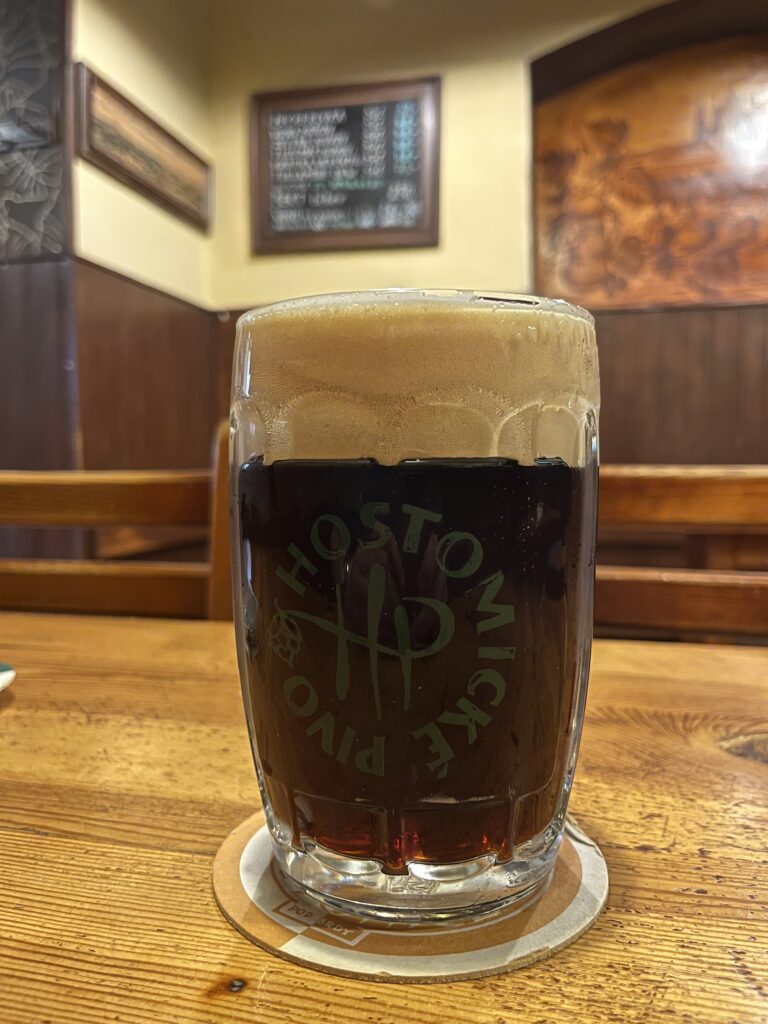 Lauantai oli reissun ainoa pilvinen päivä, mutta ilman villahousuja pärjäsi, kun lämpöä oli kolmisenkymmentä astetta. Aikainen herätys, pitkähkö päivä kävelyä siellä ja täällä (Letná-puistoa ja harhailua Holešovicessa suosittelen!) ja Hostomicen baariin heti, kun ovet avautuvat, sillä olin lukenut, että paikka on pieni ja ettei sisään tahdo mahtua. Muita asiakkaita ei vielä ollut paikalla, mutta kyllä kannatti! Kaikki kolme olutta (tmavýn lisäksi myös Juovasta tuttu Fabian 12 ja kepeämpi Fabian 10) olivat mahtavia, ja parhaiten maistui yllättäen tumma lager, jossa juotavuus ja jopa raikkaus yhdistyi täyteläiseen mallaspohjaan. Pehmeää ja ihanaa!