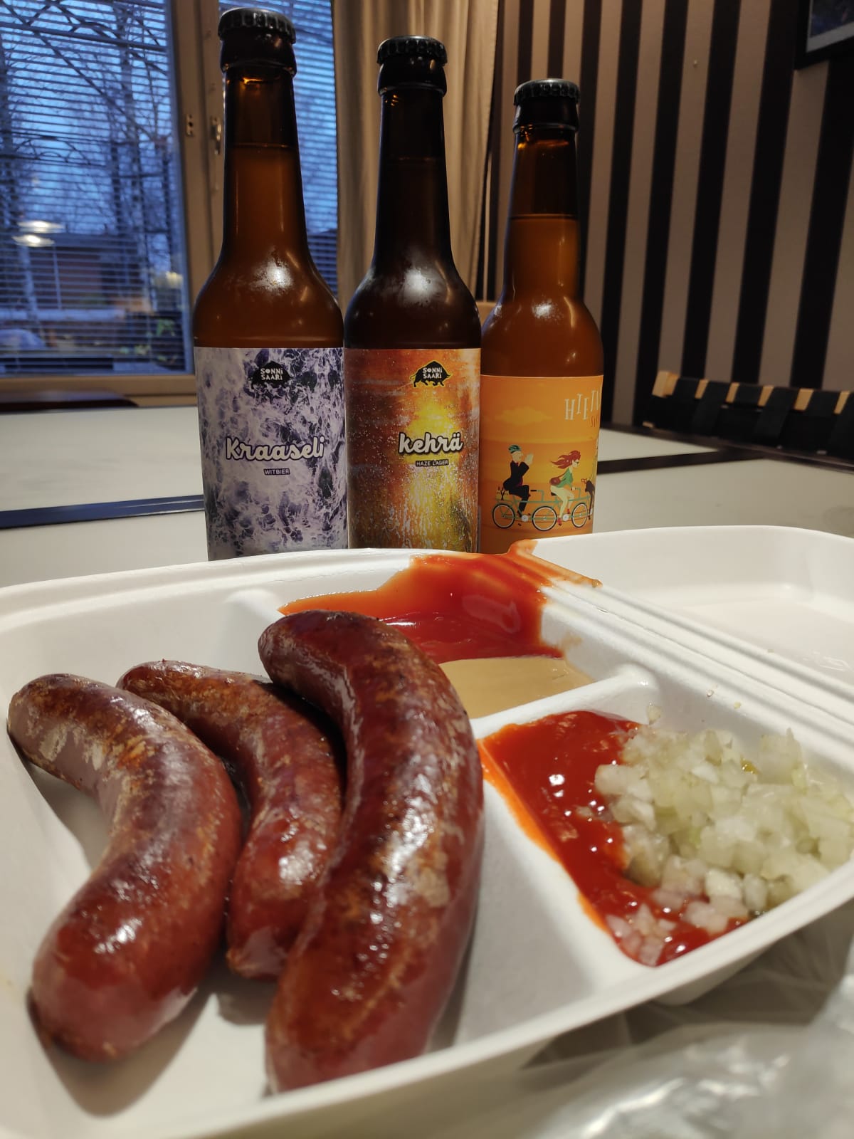 Oluiksi valikoitui lähimarketin hyllyltä kolme paikallista olutta, joiden kuvittelisin toimivan hyvin Kärkkärin kanssa. Kärkkärit hain Puolivälinkankaan Järvigrilliltä.